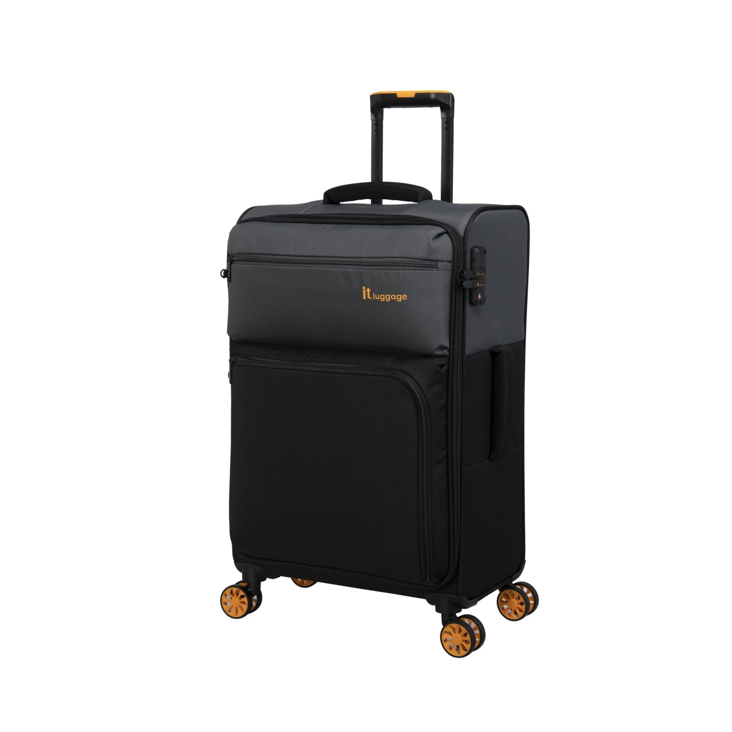 Features include an 8-wheel spinner system for superior control, a TSA lock for ultimate security, two easy-access zippered pockets on the front panel, padded grab handles for comfort, and a telescopic trolley system.
