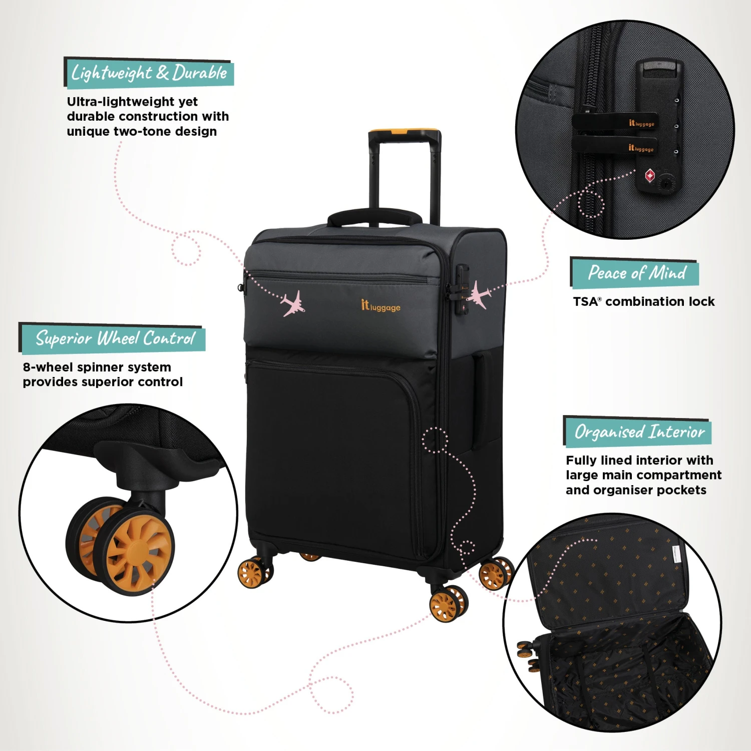 The generous 63L packing capacity makes the Duo-Tone medium the ideal option for shorter holidays, whilst its extremely lightweight construction is perfect for when flying with airlines with stricter weight restrictions.